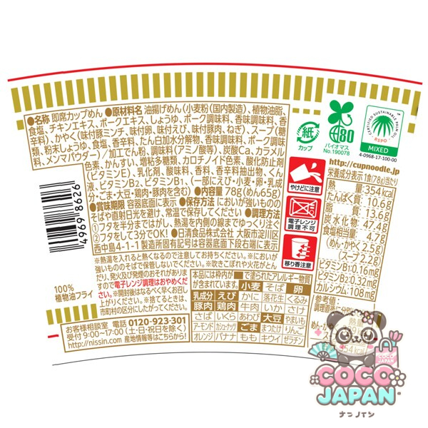맛 간장 국수의 양 보통 국수의 종류 튀김 국수 기타 닛신 식품의 식품 & 음료 · 술을 찾는 식품 & 음료 · 술 닛신 식품 > 인스턴트 식품 닛신 식품 > 컵라면 닛신 식품 > 컵라면 (라면) ※단백질 13.6g ※지질 354kcal ※에너지 4.7g ※탄수화물 그 외 ●내용량:78g ●명칭:컵누들 ●본품에 사용하고 있는 알레르기 물질:새우, 밀, 계란, 우유, 참깨, 콩, 닭고기, 돼지고기 우유, 돼지고기 조미료, 향미 조미료, 향신료), 반짝임 (맛 돼지 민치, 양념 달걀, 양념 새우, 양념 돼지고기, 파), 수프(당류, 분말 간장, 식염, 향신료, 단백 가수분해물, 향미 조미료, 돼지고기 조미료, 멘마 파우더)/가공으로 미노산 등), 탄산 Ca, 캐러멜 색소, 간질, 증점 다당류, 카로티노이드 색소, 산화 방지제 (비타민 E), 유화제, 산미료, 향료, 향신료 추출물, 군액, 비타민 B2, 비타민 B1, (일부 새우, 밀, 계란, 우유 성분, 참깨 고기 포함) ●영양 성분 표시(1식(78g)당) 에너지: 354kcal 단백질: 10.6g 지질: 13.6g 탄수화물: 47.4g 식염 상당량: 4.7g 비타민 B1: 0.16mg 비타민 B2: 0.32mg 칼슘: 10.6g