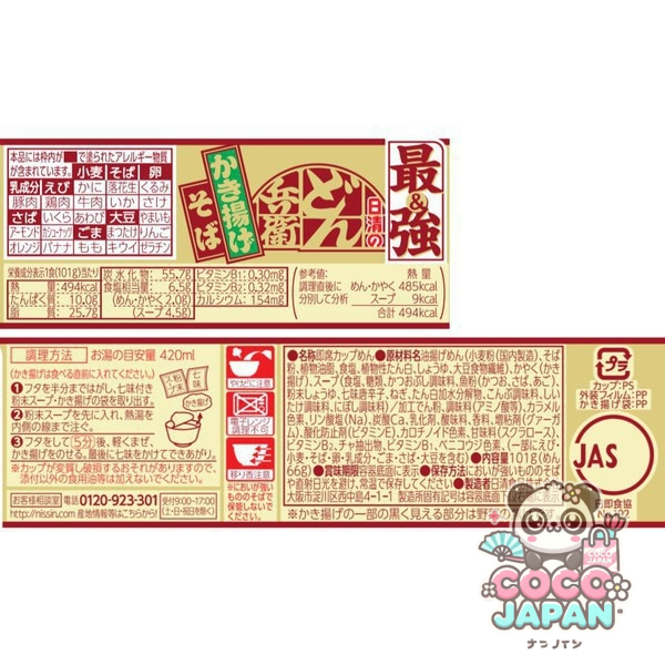 맛 튀김 소바 국수의 양 보통 다른 닛신 식품의 식품 & 음료 · 술을 찾는 식품 & 음료 · 술 닛신 식품 > 인스턴트 식품 닛신 식품 > 컵라면 닛신 식품 > 컵라면 닛신 식품 알레르겐 새우 참깨 고등어 소바 유란 대두 밀 그 외 ●내용량(면량):101g(66g) 우유, 콩식이섬유), 가다랭이(튀김), 수프(식염, 당류, 가다랑어 조미료, 어분(가다랭이, 고등어, 턱), 분말 간장, 칠미 고추, 파, 단백 가수분해물, 밥 조미료, 타케케 조미료, 니보시 조미료)/가공 전분, 조미료(아미노산 등), 카라멜 색소, 인산염(Na), 탄산 Ca, 유화제, 산미료, 향료, 증점제(과감), 산화 방지제(비타민 E) , 카로티노이드 색소, 감미료(수크랄로스), 비타민 B2, 챠 추출물, 비타민 B1, 베니코우지 색소, (일부 새우, 밀, 메밀, 계란, 우유 성분, 참깨, 고등어, 콩 포함) ●영양 성분 표시 [1식(101g)당]: 열량 494kcal(면·카야쿠:485kcal, 수프:9kcal), 단백질 10.0g, 지질 25.7g, 탄수화물 55.7g, 식염 상당량 6.5g(면·카야쿠:1.4g) 0.30mg, 비타민 B2 0.32mg, 칼슘 154mg ● 알레르겐 정보 : 밀, 메밀, 계란, 우유 성분, 새우, 고등어, 콩, 참깨